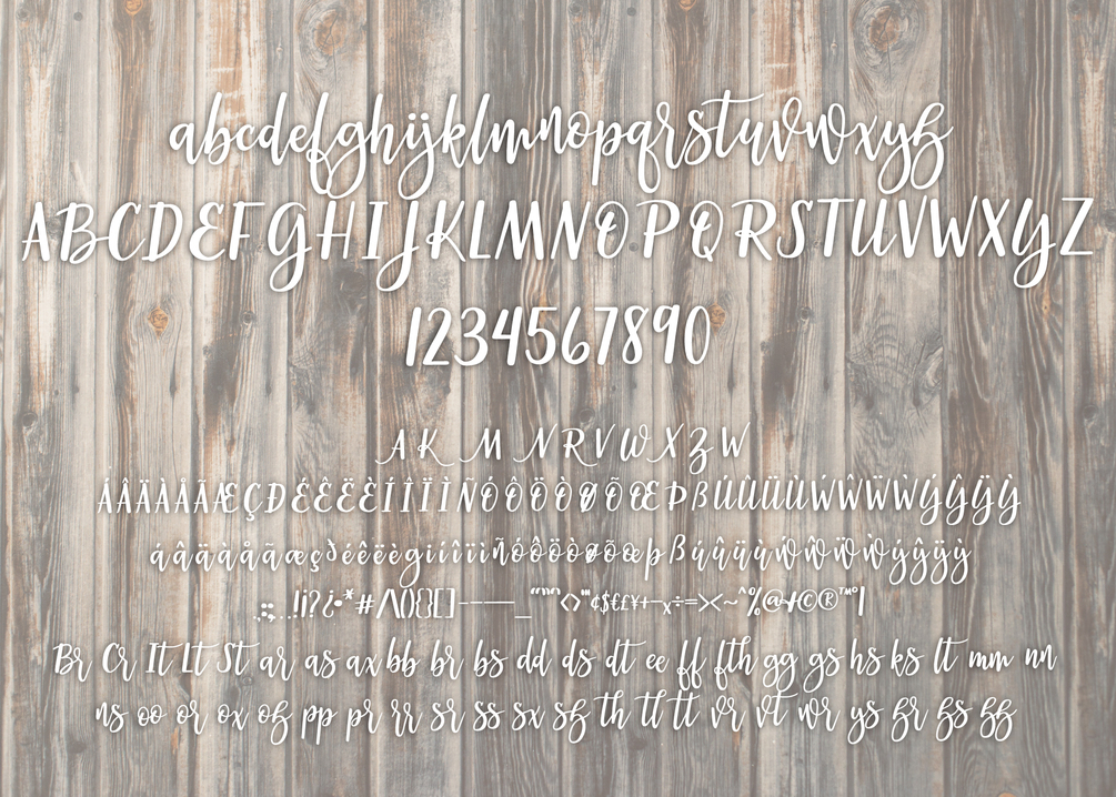A lively and bouncy hand written script font that is perfect for logos, greeting cards, menus and anything you want to give that warm and playful look. It includes full sets of numbers, punctuation and ligatures, as well as many alternate characters for a customized look.